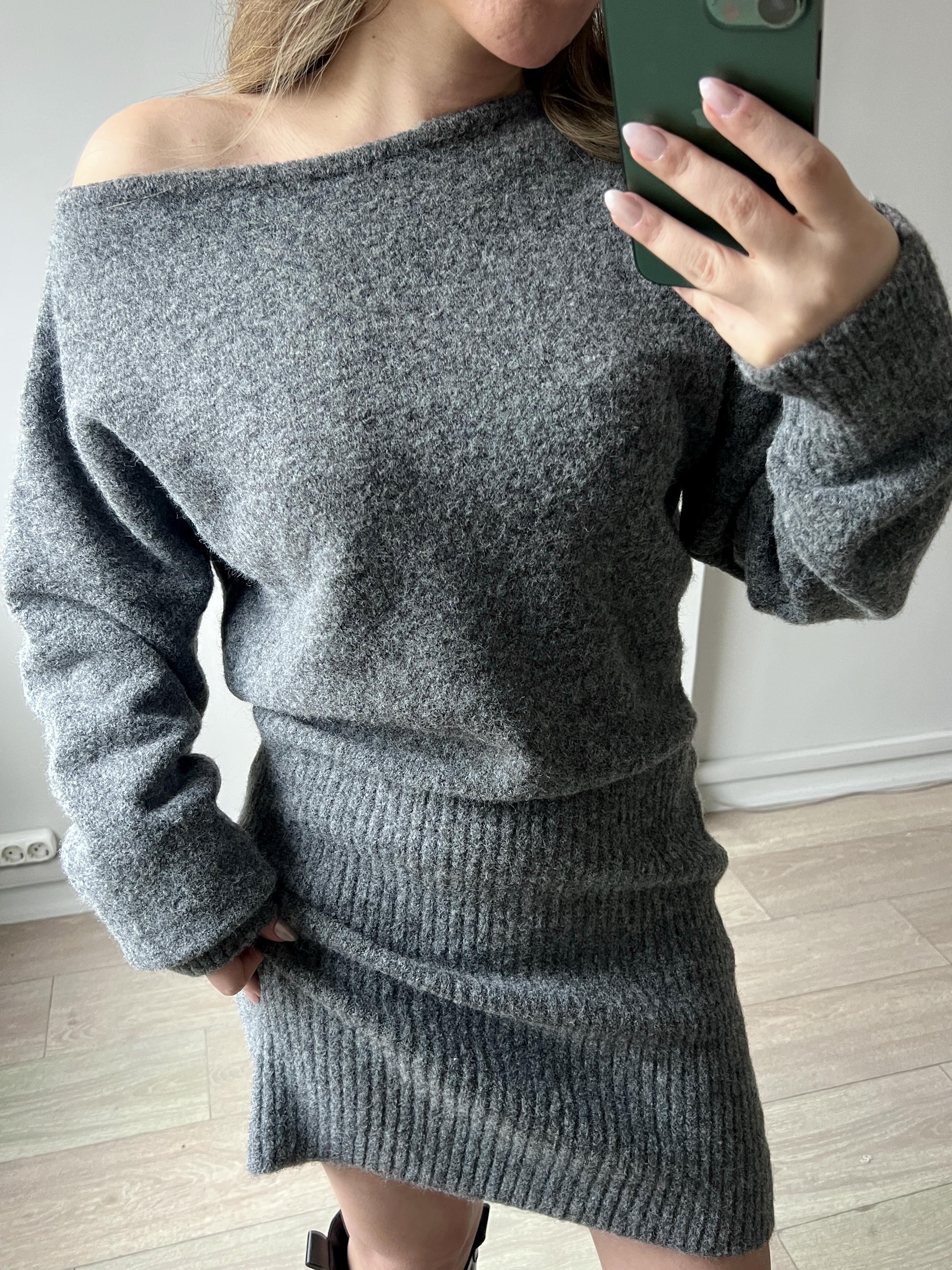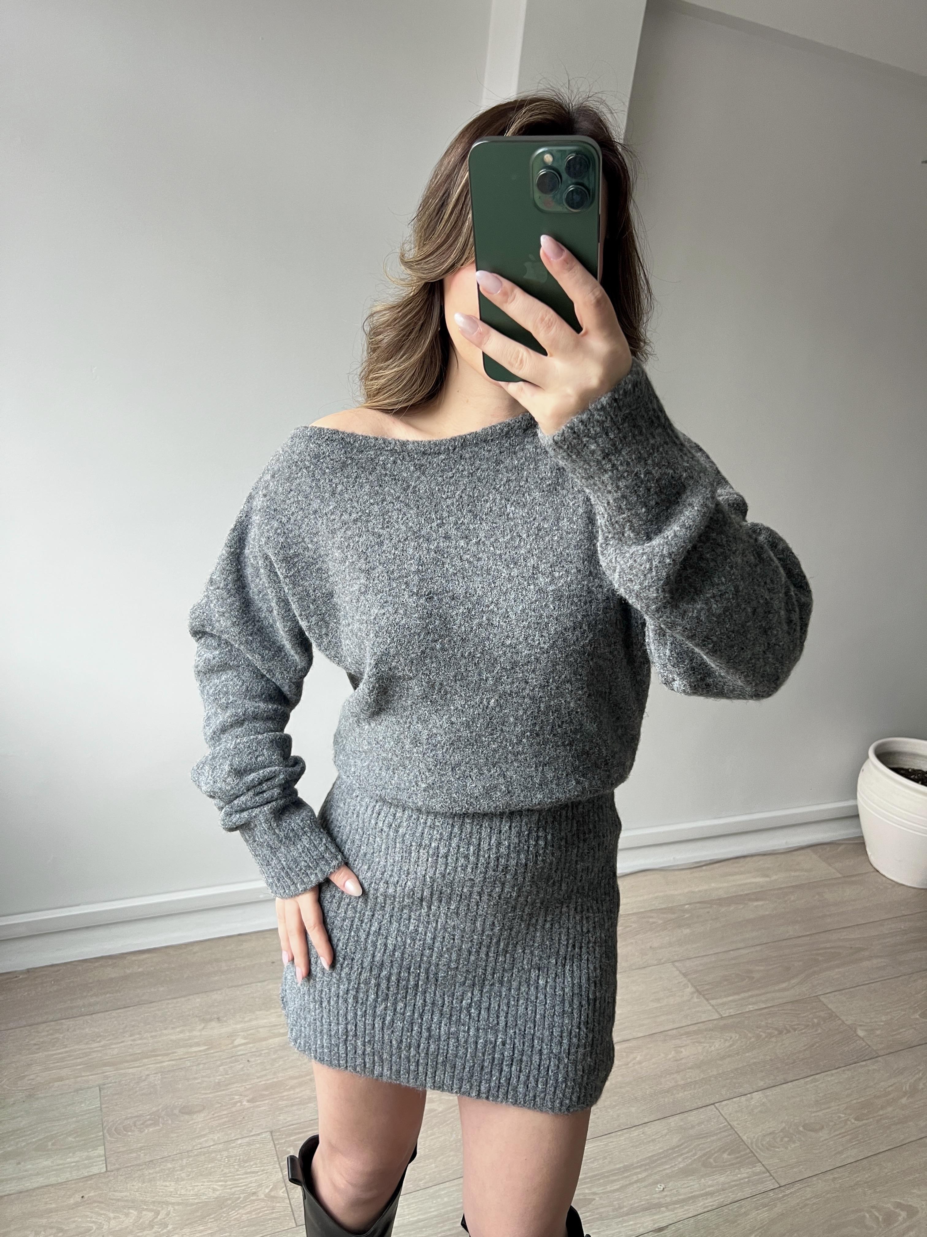 Gri Melanj Kayık Yaka Kısa Triko Elbise