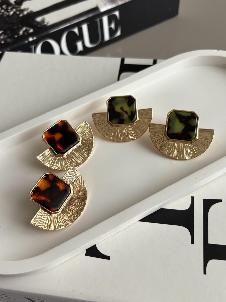Empire Serisi küpe, dikkat çekici kahverengi tonları ve gold rengi detaylarıyla öne çıkıyor. Gold detaylar, küpenin zarif yapısını vurgularken, kahverengi yüzey, ona sıcak ve çekici bir hava katmaktadır.