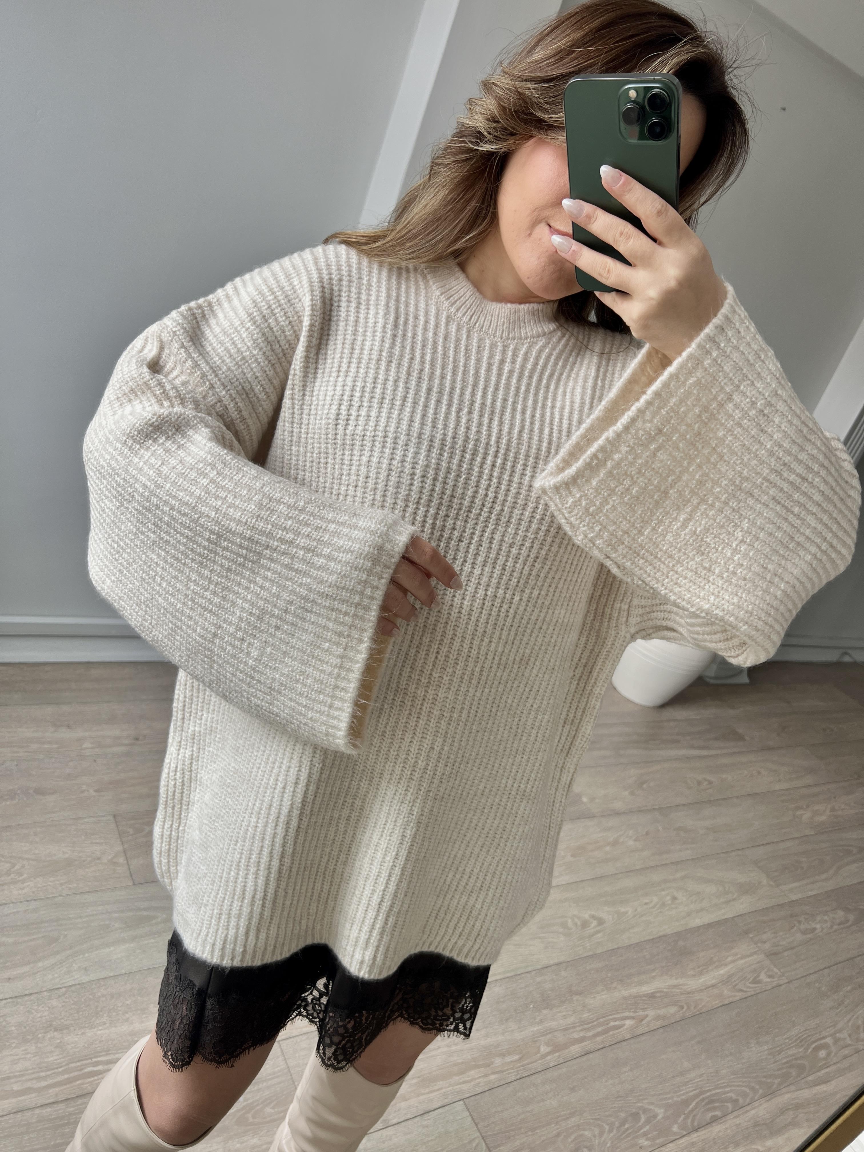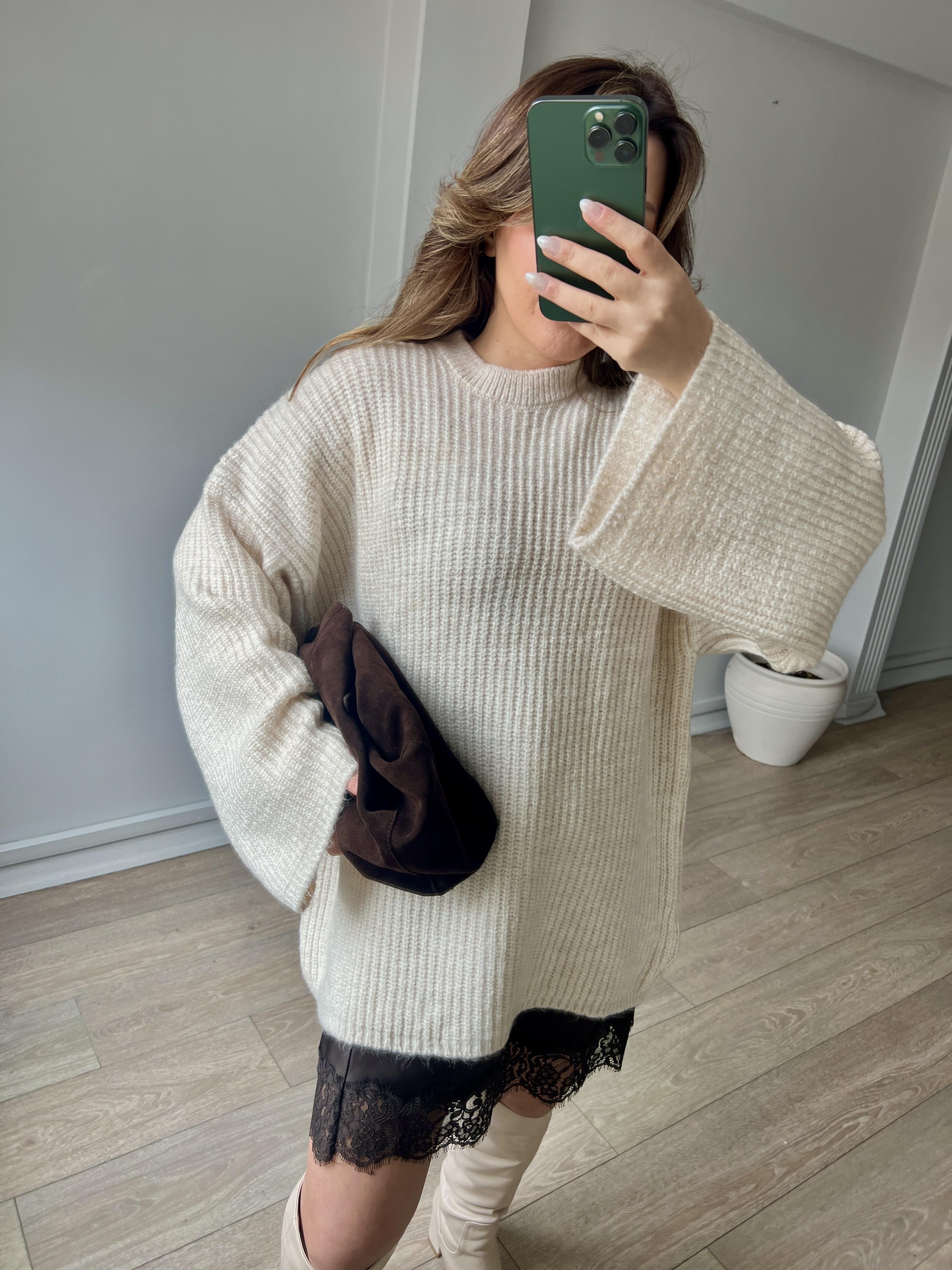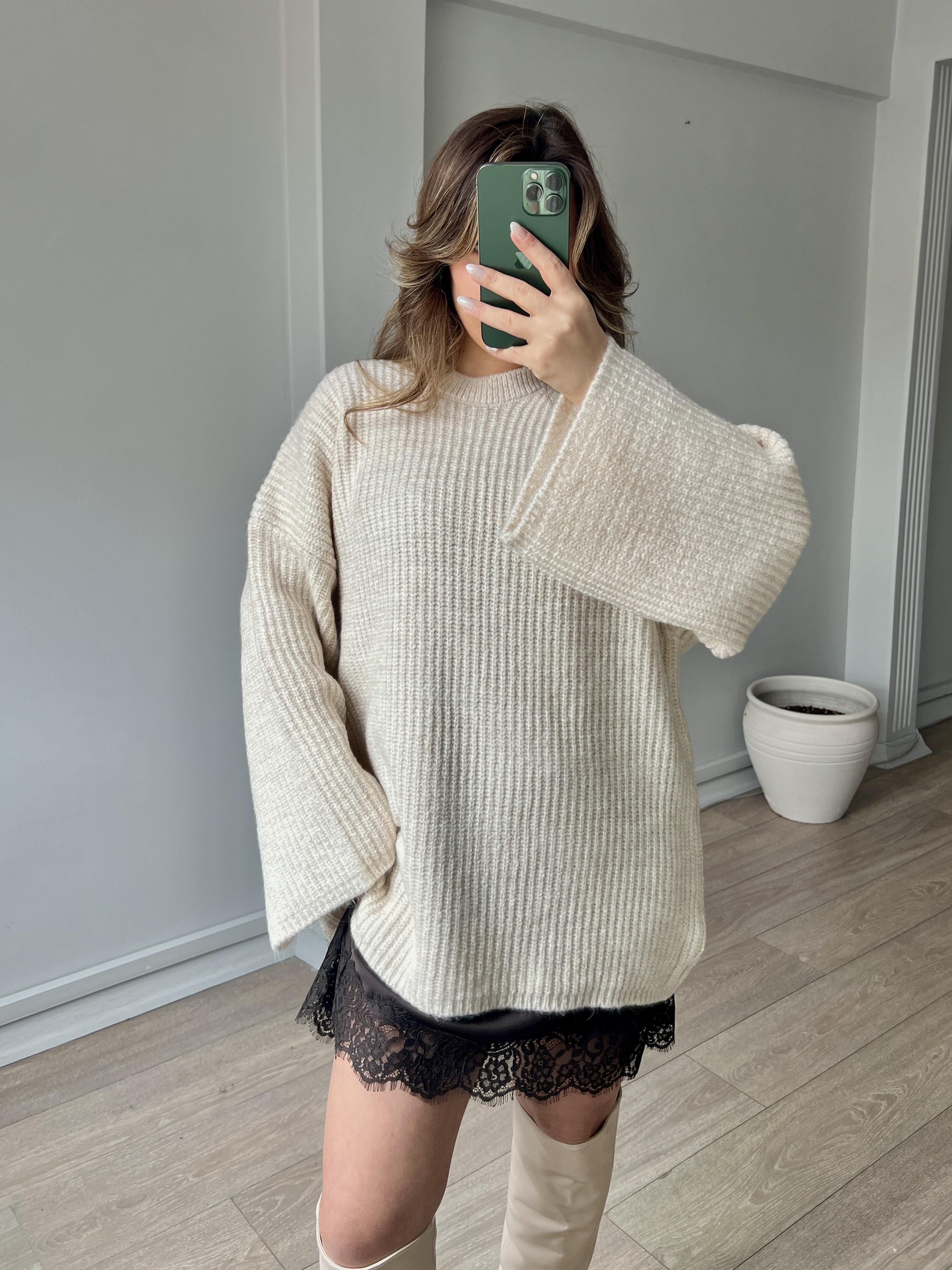Uzun Kollu Bisiklet Yaka Oversize Kadın Triko Kazak - Krem Rengi