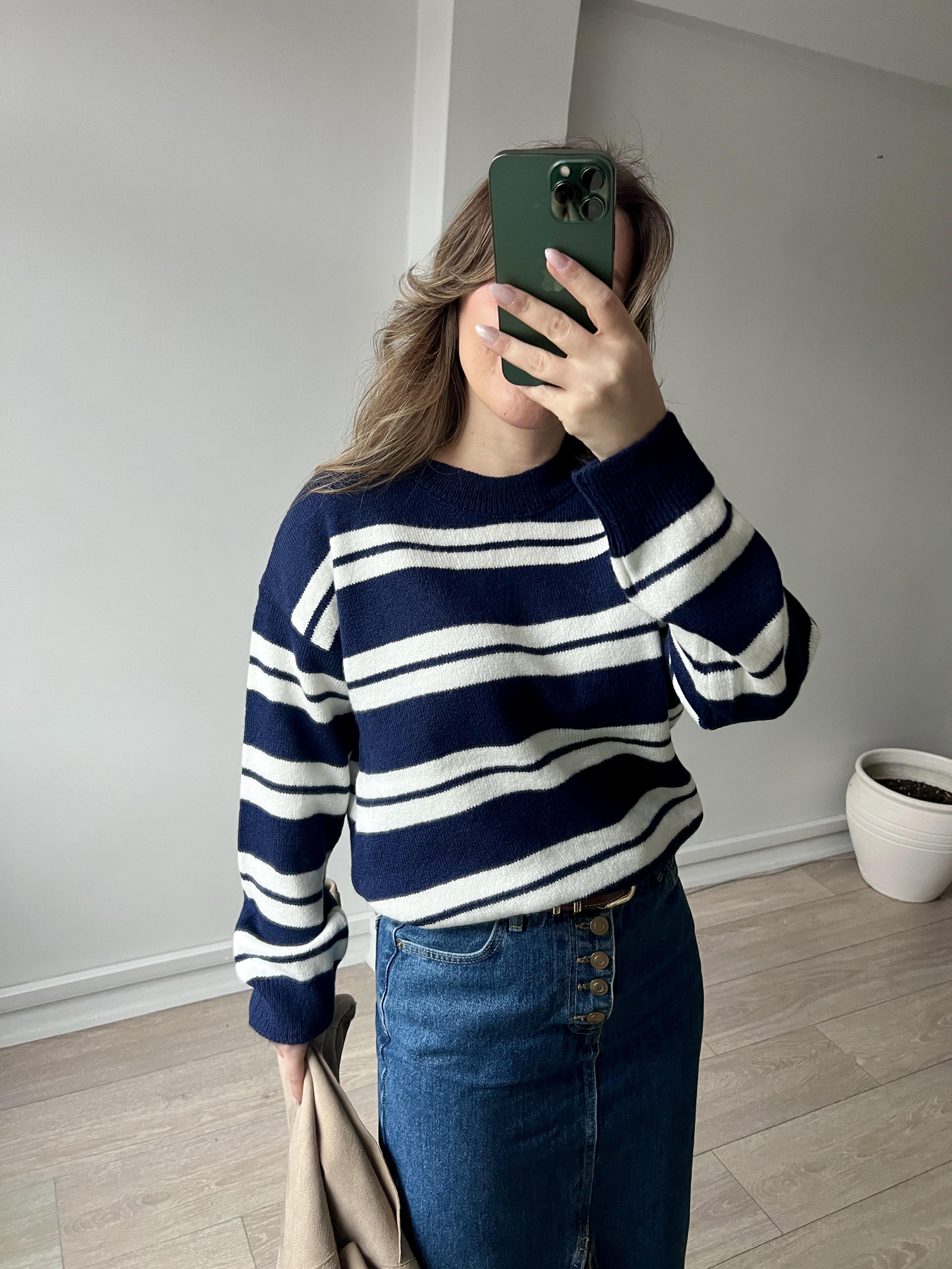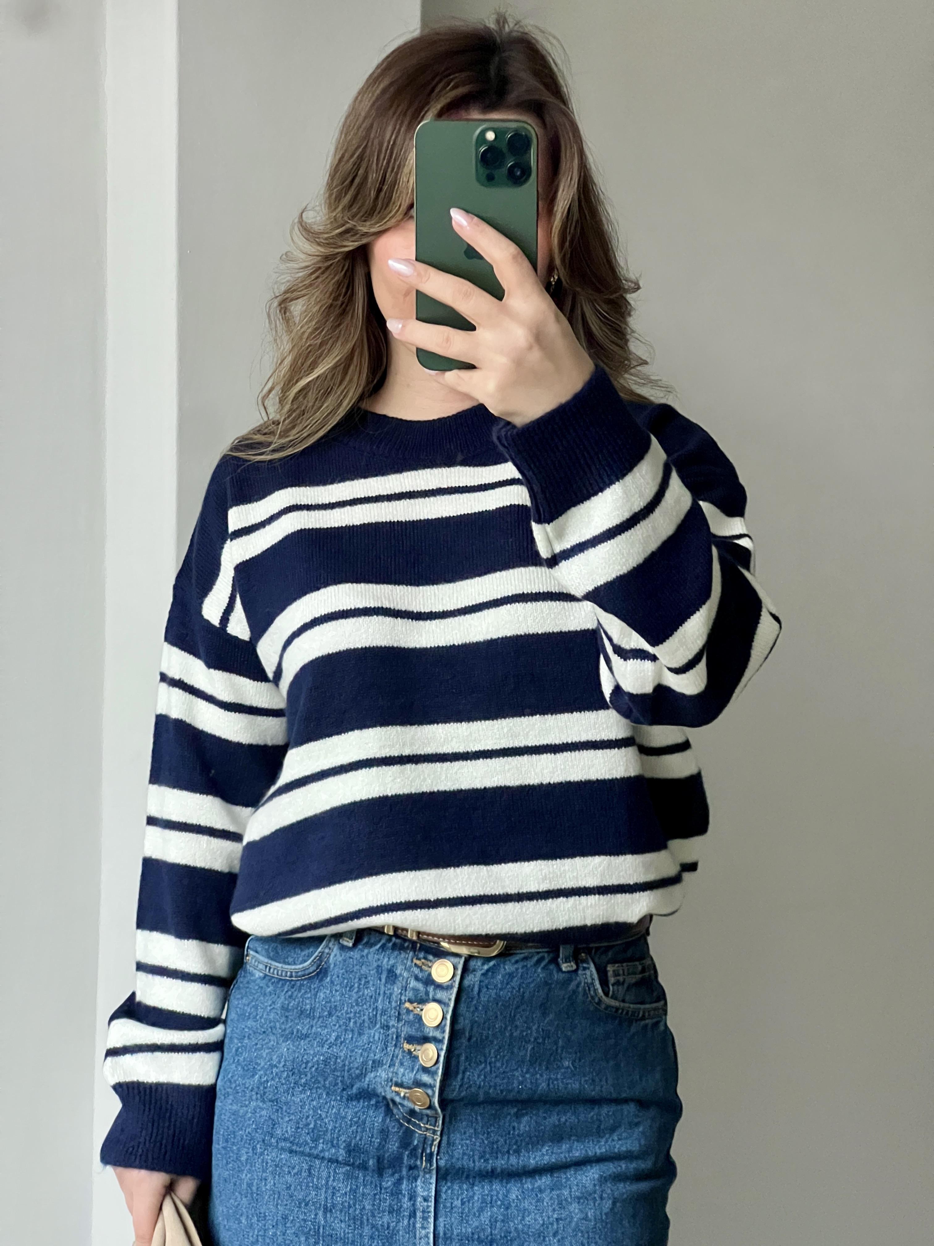 Uzun Kollu Bisiklet Yaka Lacivert Beyaz Çizgili Kadın Triko Kazak