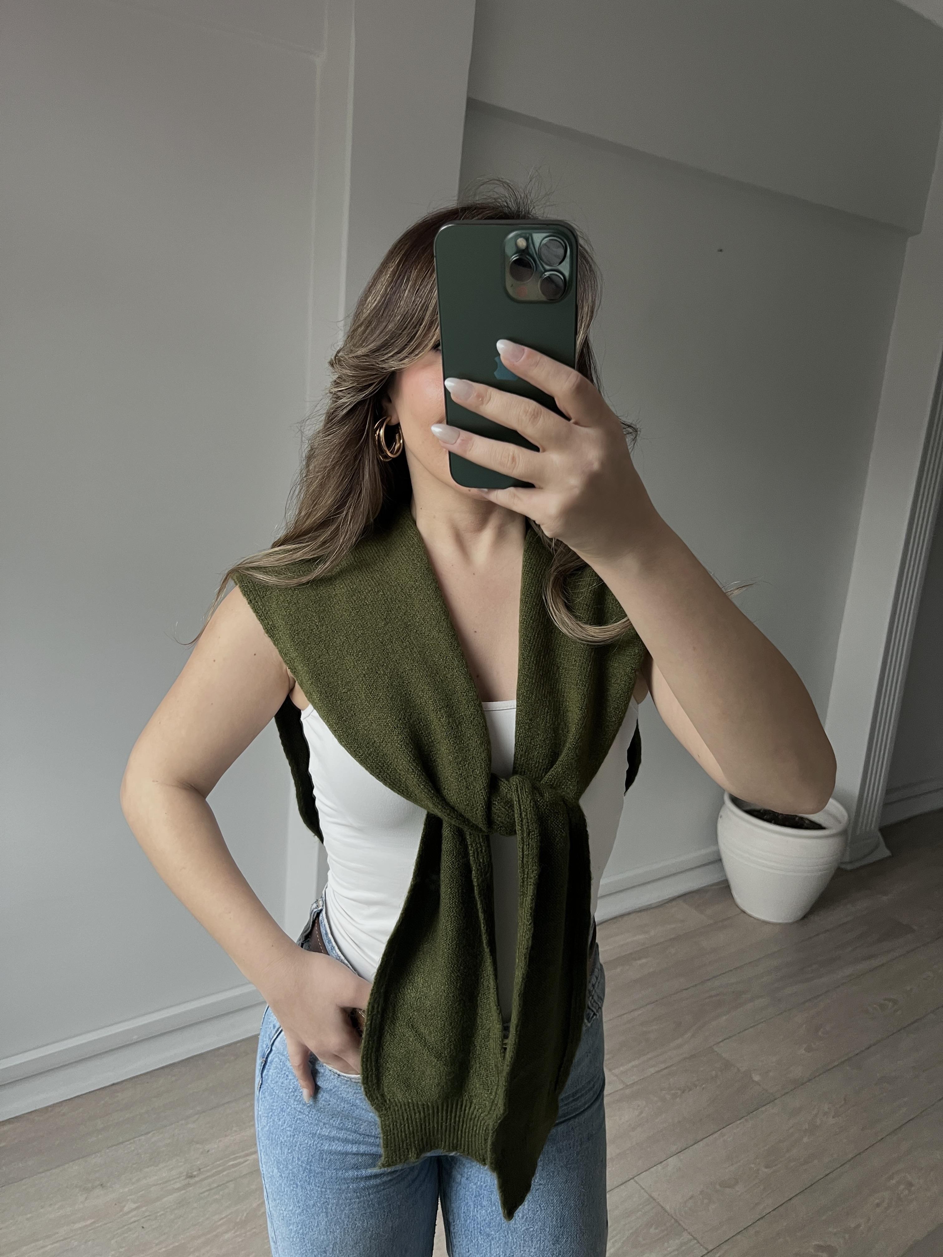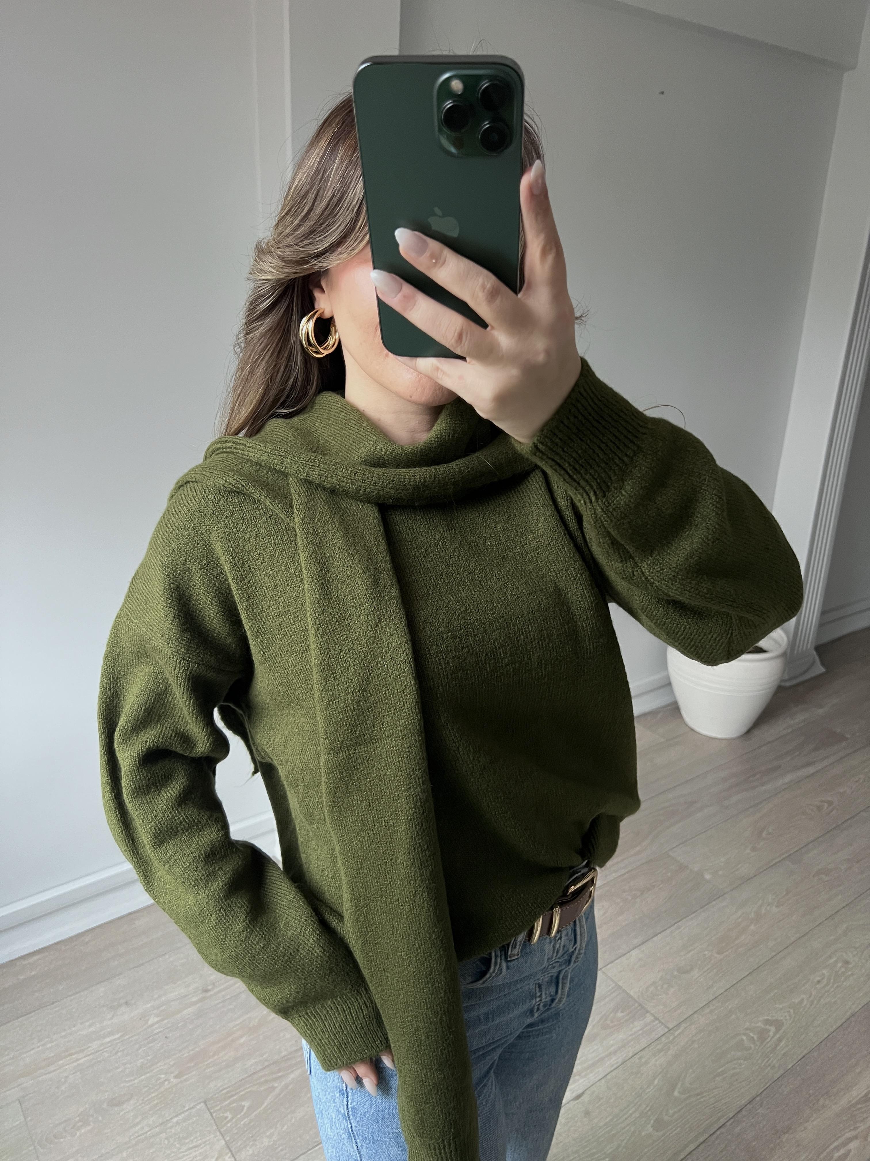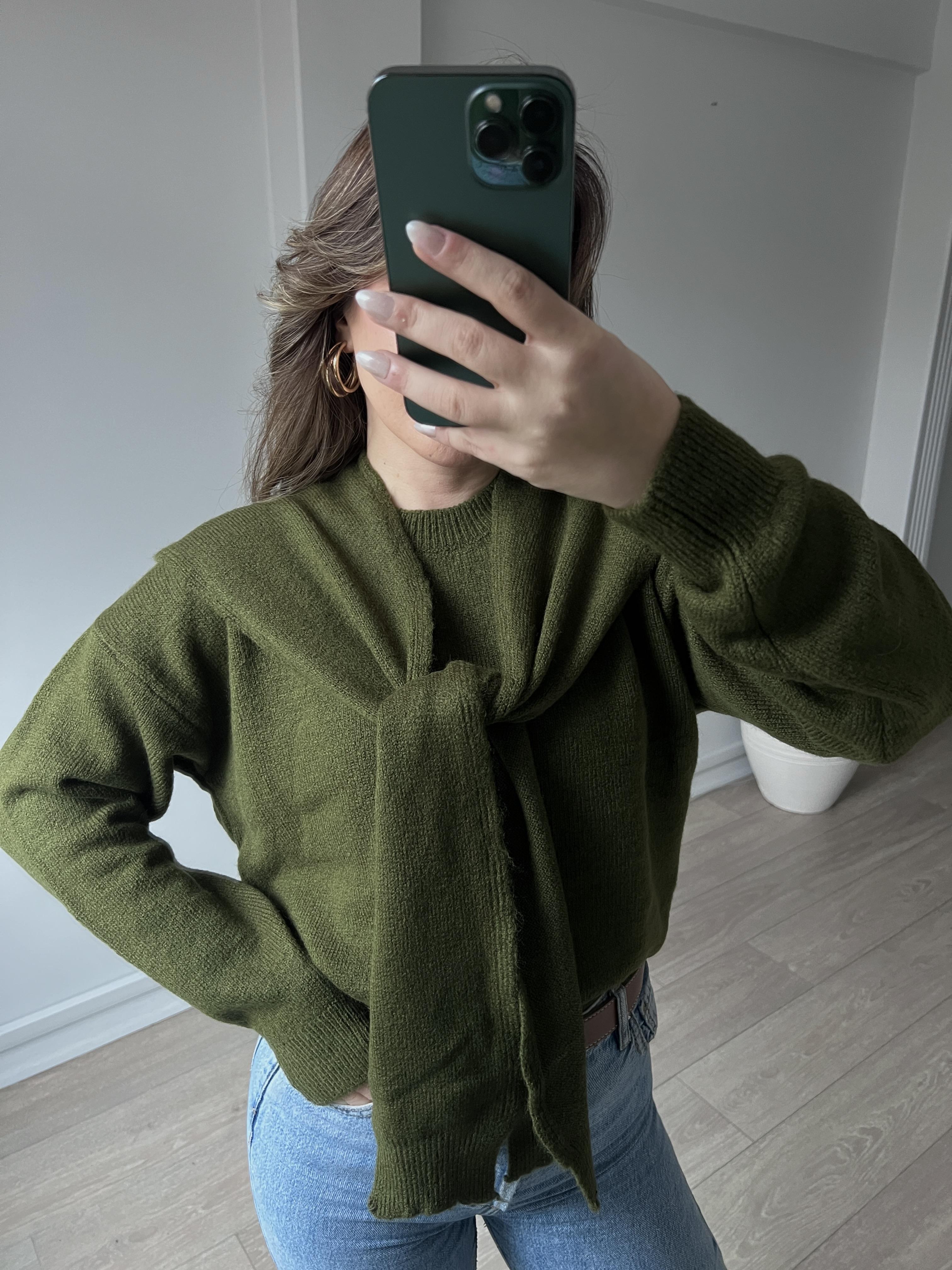Yumuşak Dokulu Bağlama Şal Detaylı Kadın Triko Yağ Yeşili Kazak